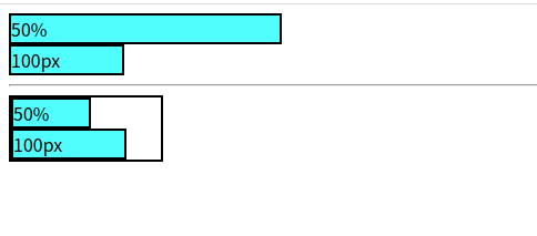 <!DOCTYPE html> <html> <head> <meta charset="utf-8" /> <title>css ๋จ์</title> <style> .fifty-percent { width: 50%; border: 2px solid black; background-color: aqua; } .one-hundred-pixels { width: 100px; border: 2px solid black; background-color: aqua; } .parent { width: 135px; border: 2px solid black; } </style> </head> <body> <div class="box fifty-percent">50%</div> <div class="box one-hundred-pixels">100px</div> <hr /> <div class="parent"> <div class="box fifty-percent">50%</div> <div class="box one-hundred-pixels">100px</div> </div> </body> </html>