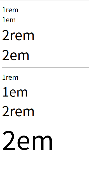 <!DOCTYPE html> <html> <head> <meta charset="utf-8" /> <title>css ๋จ์</title> <style> html { font-size: 17px; } .one-em { font-size: 1em; } .one-rem { font-size: 1rem; } .two-em { font-size: 2em; } .two-rem { font-size: 2rem; } .parent { font-size: 30px; } </style> </head> <body> <div class="one-rem">1rem</div> <div class="one-em">1em</div> <div class="two-rem">2rem</div> <div class="two-em">2em</div> <hr /> <div class="parent"> <div class="one-rem">1rem</div> <div class="one-em">1em</div> <div class="two-rem">2rem</div> <div class="two-em">2em</div> </div> </body> </html>