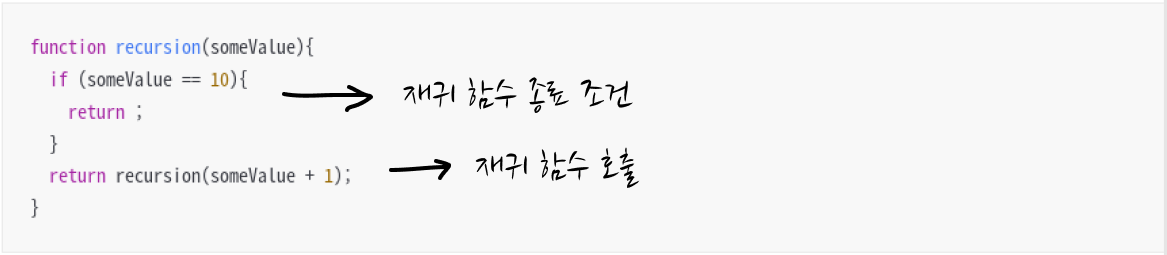 function getMyPositionInLine(person){ if (person.nextInLine == null){ //์์ฌ๋ ์กด์ฌ x return 1; } return 1 + getMyPositionInLine(person.nextInLine); }์ด๋ ๊ฒ ํจ์ ์์์ ์๊ธฐ ์์ (ํจ์)์ ๋ค์ ํธ์ถํ๋ ํจ์๋ฅผ ์ฌ๊ท ํจ์๋ผ๊ณ ํ๋ค.