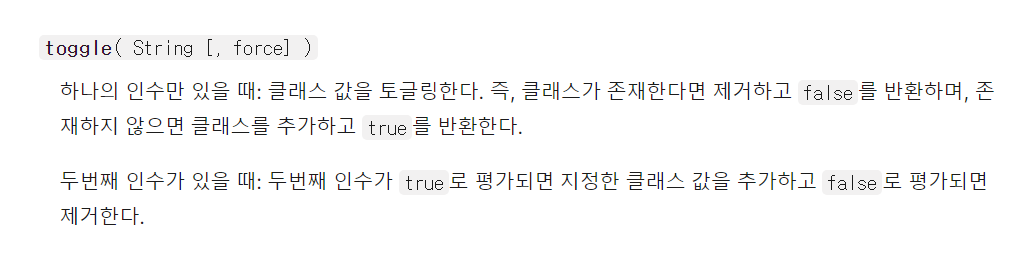 button.classList.contains("active") ? button.classList.remove("active") : button.classList.add("active")์์ ์ฝ๋๋ฅผ toggle ๋ฉ์๋๋ฅผ ์ฌ์ฉํด ์๋์ ๊ฐ์ด ์ธ ์ ์๋ค.
