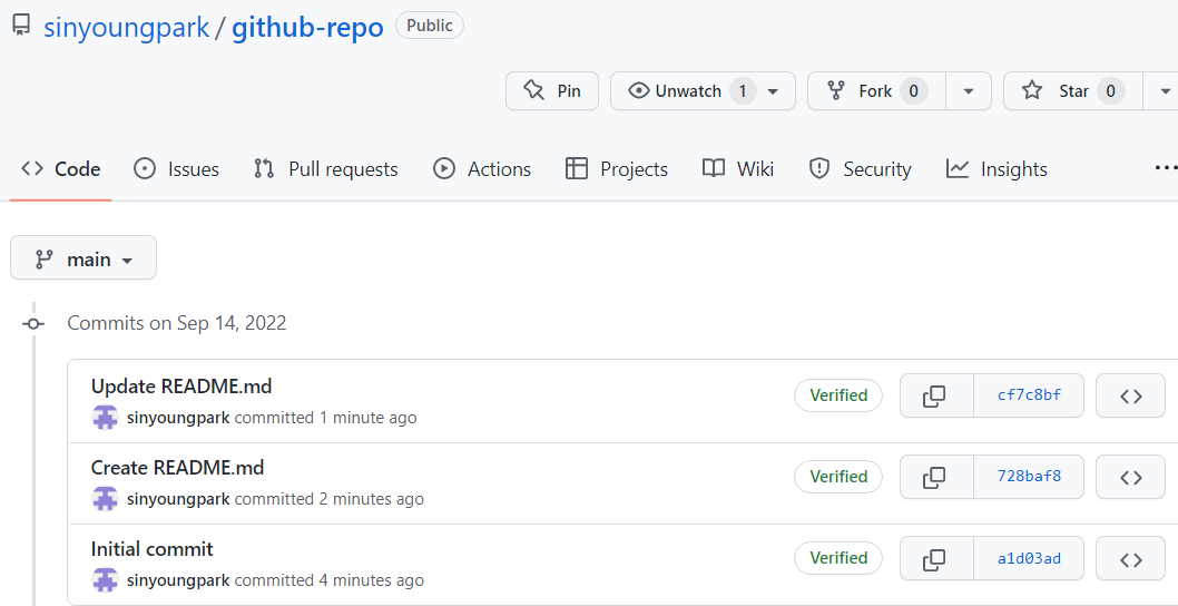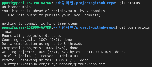 $git push origin main /*git push + ํ์ฌ github storage ์์น + pushํ ๋ธ๋ฐ์น ์์น*/clone์ ํด์จ ๋ฆฌ๋ชจํธ ์ ์ฅ์๋ ์๋์ผ๋ก origin ์ผ๋ก ๋ฑ๋ก๋๋ค.