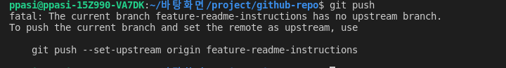 ํ์ง๋ง main ๋ธ๋์น๋ก push๋ฅผ ํ ํ feature ๋ธ๋์น์์ ๋ฆฌ๋ชจํธ upstream์ push๋ฅผ ํ๋ ค๊ณ ํ๋ฉด ๋ค์๊ณผ ๊ฐ์ ์๋ฌ๊ฐ ๋ฌ๋ค.