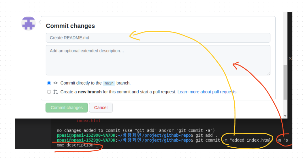 ์ฒซ๋ฒ์งธ ์ปค๋ฐ -m "added index.html" ์ด commit์ ์ ๋ชฉ๋ถ๋ถ์ด ๋๊ณ , ๋๋ฒ์งธ ์ปค๋ฐ -m "somee description"์ด description ๋ถ๋ถ์ด ๋๋ค.