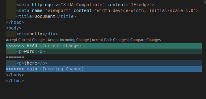 ๋ฌธ์ ์ํฉ์ ๋ง๋ค์ด๋ณด์. ์๋ก ๋๊ธฐํ๋ฅผ ์งํํ์ง ์๊ณ ๋์์ ๊ฐ์ ํ์ผ์ ์์ ์ํค๋ ๊ฒ์ด๋ค. master ๋ธ๋์น์์ index.html ํ์ผ์ ์์ ํ๊ณ featureํ์ผ์์ index.html ํ์ผ์ ์์ ํด๋ณด์.