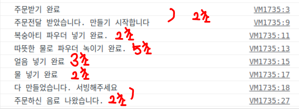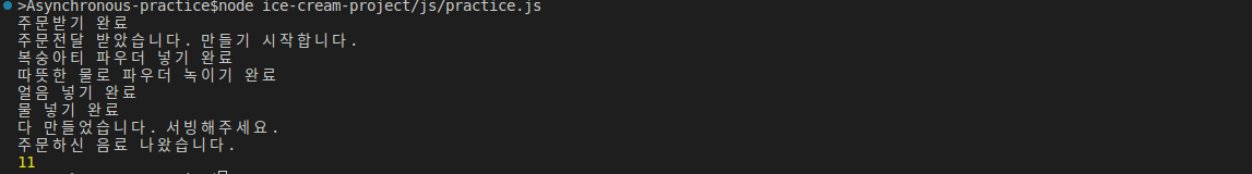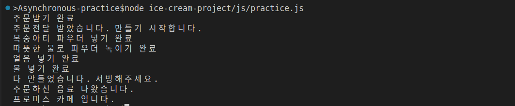 order(2000, () => console.log("์ฃผ๋ฌธ๋ฐ๊ธฐ ์๋ฃ")) .then(() => order(0000, () => console.log("์ฃผ๋ฌธ์ ๋ฌ ๋ฐ์์ต๋๋ค. ๋ง๋ค๊ธฐ ์์ํฉ๋๋ค."))) .then(() => order(2000, () => console.log("๋ณต์ญ์ํฐ ํ์ฐ๋ ๋ฃ๊ธฐ ์๋ฃ"))) .then(() => order(5000, () => console.log("๋ฐ๋ปํ ๋ฌผ๋ก ํ์ฐ๋ ๋ น์ด๊ธฐ ์๋ฃ"))) .then(() => order(3000, () => console.log("์ผ์ ๋ฃ๊ธฐ ์๋ฃ"))) .then(() => order(2000, () => console.log("๋ฌผ ๋ฃ๊ธฐ ์๋ฃ"))) .then(() => order(0000, () => console.log("๋ค ๋ง๋ค์์ต๋๋ค. ์๋นํด์ฃผ์ธ์."))) .then(() => order(2000, () => console.log("์ฃผ๋ฌธํ์ ์๋ฃ ๋์์ต๋๋ค.")))then์ผ๋ก ์ค์ค์ด ์ฐ๊ฒฐ๋ ์ด๋ฌํ ๊ตฌ์กฐ๋ฅผ ํ๋ก๋ฏธ์ค ์ฒด์ด๋์ด๋ผ๊ณ ํ๋ค.