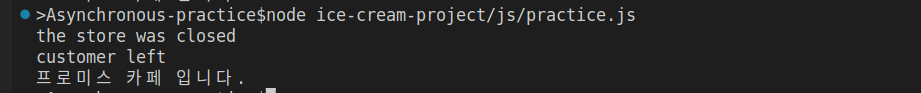 let is_store_open = false; let order = (time, work) => { return new Promise((resolve, reject) => { if(is_store_open){ setTimeout(() => { resolve(work()); }, time); } else { reject(console.log('the store was closed')); } }); } order(2000, () => console.log("์ฃผ๋ฌธ๋ฐ๊ธฐ ์๋ฃ")) .then(() => order(0000, () => console.log("์ฃผ๋ฌธ์ ๋ฌ ๋ฐ์์ต๋๋ค. ๋ง๋ค๊ธฐ ์์ํฉ๋๋ค."))) .then(() => order(2000, () => console.log("๋ณต์ญ์ํฐ ํ์ฐ๋ ๋ฃ๊ธฐ ์๋ฃ"))) .then(() => order(5000, () => console.log("๋ฐ๋ปํ ๋ฌผ๋ก ํ์ฐ๋ ๋ น์ด๊ธฐ ์๋ฃ"))) .then(() => order(3000, () => console.log("์ผ์ ๋ฃ๊ธฐ ์๋ฃ"))) .then(() => order(2000, () => console.log("๋ฌผ ๋ฃ๊ธฐ ์๋ฃ"))) .then(() => order(0000, () => console.log("๋ค ๋ง๋ค์์ต๋๋ค. ์๋นํด์ฃผ์ธ์."))) .then(() => order(2000, () => console.log("์ฃผ๋ฌธํ์ ์๋ฃ ๋์์ต๋๋ค."))) .catch(() => console.log('customer left')) .finally(() => console.log("ํ๋ก๋ฏธ์ค ์นดํ ์ ๋๋ค."));