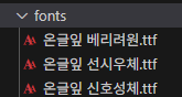 @font-face{ font-family : 'μ¨κΈμ-μ μμ°μ²΄'; //μνλ μ΄λ¦μΌλ‘ μ§μ νλ€. src : url('./fonts/μ¨κΈμ\ μ μμ°μ²΄.ttf'); //ν°νΈκ° μ μ₯λΌ μλ κ²½λ‘ } h1{ font-family : 'μ¨κΈμ-μ μμ°μ²΄'; }μμκ² μ μ©λ κ±Έ νμΈν μ μλ€.