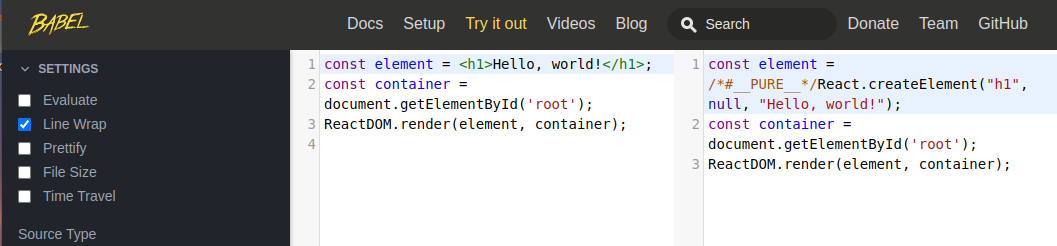 ๊ทธ๋์ JSX๋ฌธ๋ฒ์ ์ฌ์ฉํ๋ฉด ํจ์ฌ ์ฝ๋์ ๋ณต์ก๋๊ฐ ๋ฎ์์ง๊ณ , ๊ฐ๋ ์ฑ์ด ์ฌ๋ผ๊ฐ๋ค. JSX์ฝ๋๋ฅผ ์ฐ๋ฉด babel์ด๋ผ๋ ๊ฒ์ด JSX์ฝ๋๋ฅผ React.createElement๋ก ๋ณํ์ ํด์ค๋ค.