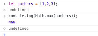 let numbers = [1,2,3]; console.log(Math.max(numbers));numbers๋ผ๋ ๋ฐฐ์ด์์ ๊ฐ์ฅ ํฐ ์๋ฅผ ์ฐพ๊ณ ์ถ๋ค. ํ์ง๋ง Math.max๋ ์ธ์๊ฐ์ผ๋ก ์ซ์ ํ์ ๋ง ๋ฐ๊ธฐ ๋๋ฌธ์ ์๋ฌ๋ฅผ ๋ธ๋ค.