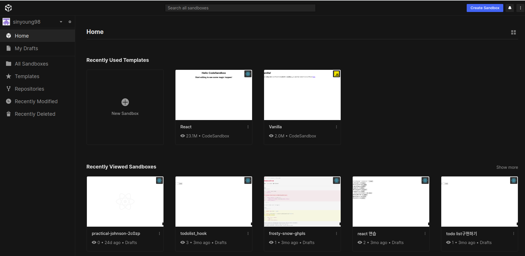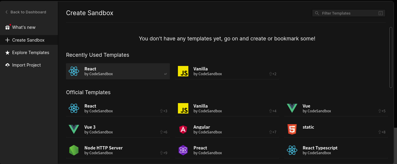 2. new sandbox를 클릭하고, 리액트를 클릭해준다.