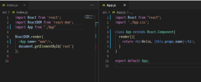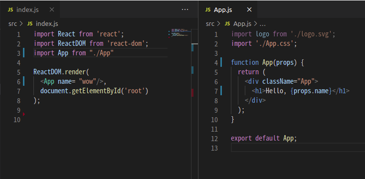 ํจ์ ์ปดํฌ๋ํธ๋ก <App /> ํ๊ทธ๋ฅผ ๋ง๋ค์๋ค. ์ด ์ปดํฌ๋ํธ๋ index.js์์ ์ฌ์ฉํ๊ณ ์๊ณ , <App name="wow" />๋ก name์ด๋ผ๋ props๋ฅผ ๋๊ฒจ์ฃผ๊ณ ์๋ค.