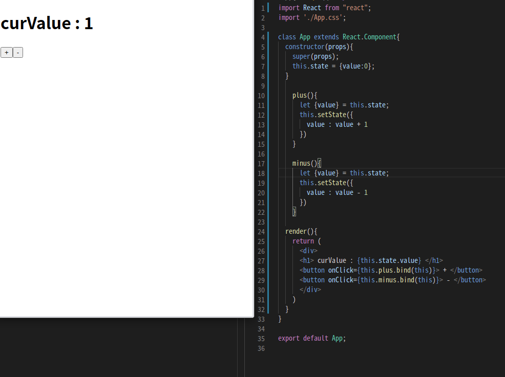 ๊ฐ๋จํ๊ฒ button์ ๋๋ฌ์ +, -๋ฅผ ํ ์ ์๋ ์ปดํฌ๋ํธ๋ฅผ ๋ง๋ค์ด๋ณด์๋ค. ์ฌ๊ธฐ์ constructor๋ฅผ ๋ณด๋ฉด this.state = {value : 0} ์ด ๋ค์ด๊ฐ ์๋ ๊ฒ์ ๋ณผ ์ ์๋ค.